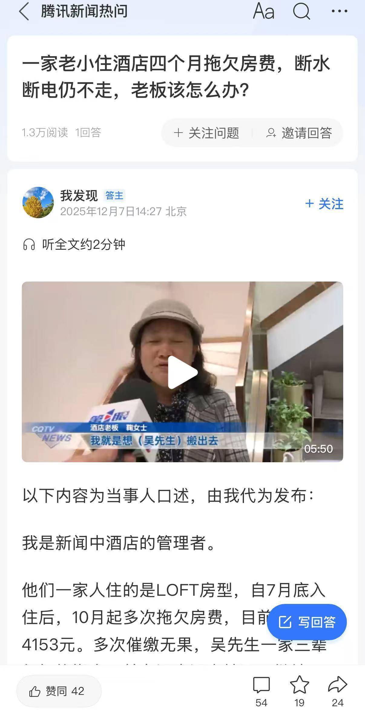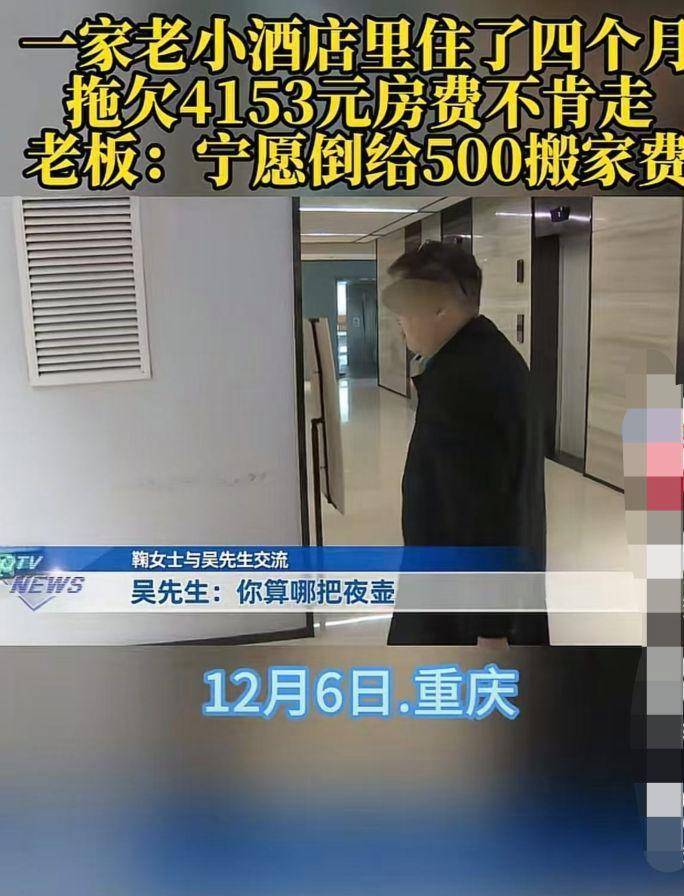 近日,一家人拖欠重庆一酒店4153元房费,老板称愿倒贴500元搬家费,这家人还不肯走的事件引发关注。12月7日,酒店老板在腾讯新闻“热问”发声讲述了此事。